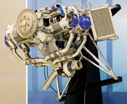 The 227 hp SMA engine has lower noise and vibration than conventional engines. Computerized management helps its four-cylinder, four-stroke, turbocharged, horizontally opposed configuration to run efficiently. Designed to retrofit most 180 to 250 hp aircraft, the engine is targeting FAA certification soon.