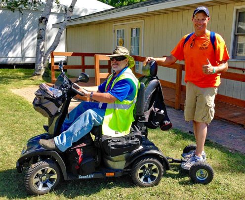 When Dave can attend he uses a scooter (that can go literally anywhere …it’s a golden ride). He’s fitted his deluxe scooter with a tiny wheeled trailer, which I mount and then hang on for dear life as we wheel all over the grounds in minutes. Man, do I miss that speedy, if overly attention-getting, ride.