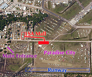 As many prepare for the opening of Sun ‘n Fun in only three weeks, I attended a meeting relative to the area known as Paradise City or the Light Plane Area, though some simply call it the Ultralight Area. Whatever you call it, dramatic changes are underway and you should pay attention. *** Our meeting was arranged by 23-year area chairman Dave Piper with brand new Sun ‘n Fun boss John “Lites” Leenhouts (yes, everyone calls him “Lites,” a nickname he picked up in the Navy*). Also attending were operations boss Wayne Boggs plus convention director Laura Vaughn and exhibit director Bonnie Perkins. Dave assembled this group so we could discuss changes to come. *** For 2013, the LSA Mall will relocate to the entrance to Paradise City, that is, right alongside Doolittle Road, the paved road that runs east/west just inside the main gate, connecting the Florida Air Museum with Paradise City and on down to Choppertown (see map). The LSA Mall started just inside the main gate for 2008 and 2009, then moved to a prominent spot in the Southeast Exhibit Area for ’10, ’11, and ’12 (see aerial view). A move to Paradise City will likely be the permanent location for the LSA Mall and it will become a beacon for the Light Plane Area. *** Why is this important? — For those that remember, the former Ultralight Area was once one of the most dynamic on the Sun ‘n Fun grounds. Flying goes on all day (except during the main airshow… but see below!) and after the main event ended a wave of people flooded the Ultralight Area where flying went on until sunset. The variety of airplanes was incredible but the main draw was how close you could get to the action. *** Then came Light-Sport Aircraft, along with a flock of new business people, many of whom didn’t know the charm of Paradise City. They looked at other exhibit locations that were perceived to offer higher traffic (perhaps correctly, perhaps not). Paradise City suffered for a few years but has begun to revive. In 2011, people standing along the fence line right near the Paradise City runway looked somewhat like the old days. |||| Game Changer — Most visitors to the area didn’t notice that the runway had been greatly improved, with a major ditch at the west end smoothly covered to allow a safety overshoot. The same will happen to the big ditch on the east end, probably in the next year or two. The runway was always long enough for Light-Sport Aircraft and now it appears much more user friendly. But even those costly changes are not the really big news. *** At the mid-February meeting, operations boss Wayne Boggs said the Paradise City runway can remain in operation even while the main airshow is happening, except for a short closure while the military jet teams like the Thunderbirds or the warbirds perform. This means LSA and other light recreational aircraft can operate from Paradise City nearly all day long. LSA vendors can offer demo flights to prospective customers without those people having to leave the Sun ‘n Fun grounds. This is the best news for Paradise City in years and I’m excited about its potential.