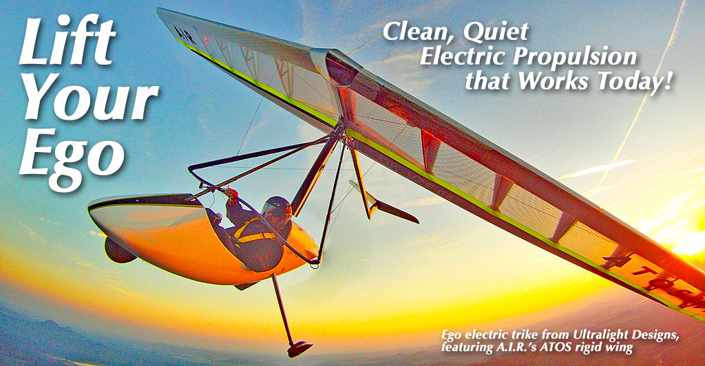 First introduced in 2018 Ego Light was purposefully designed in an electric version for standard ATOS glider owners, the foot-launched variety. Gross weight on the electric propulsion Ego, using a standard ATOS glider is compatible with U.S. Part 103 rules. The light trike is equipped with smaller single-pack battery giving a flight endurance around one hour. “Ego is designed specifically for thermal flying,” said the company. This means a one-hour endurance is plenty to carry you aloft where you shut it off and hunt for lifting conditions.